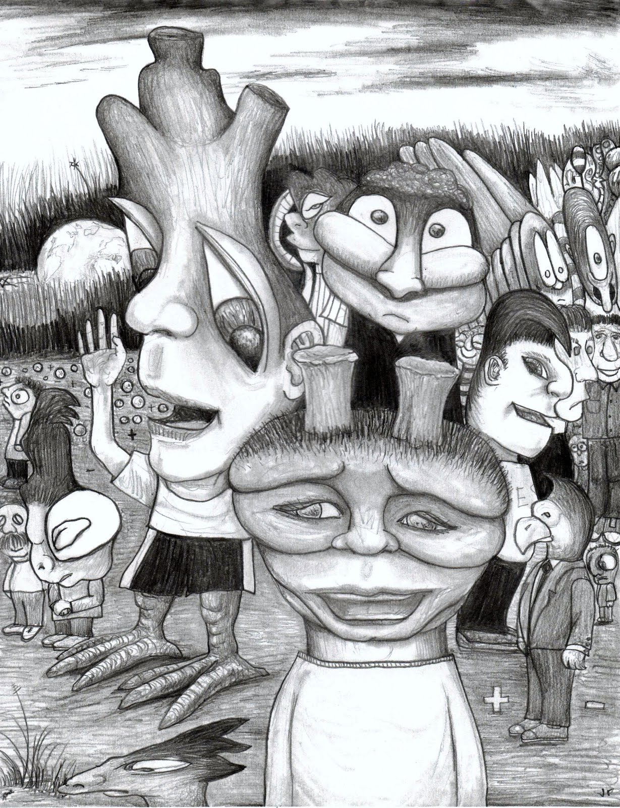 In our country, we thought that we could see very well with our huge eyes. At least we thought so until a visiting stranger told us that having enormous eyes wasn't a true indication of sight! He helped us see that without clear vision, we would never know if the others around us were smiling, frowning, upset, or happy. Now I understand that I had quite often misunderstood how the others felt because I really couldn't see their faces very well. This also explains why we bump our noses a lot! I also now realize that without large ears, we haven't been able to listen very well to each other. Looking closer at my friends, I realized that we didn't have any ears at all!